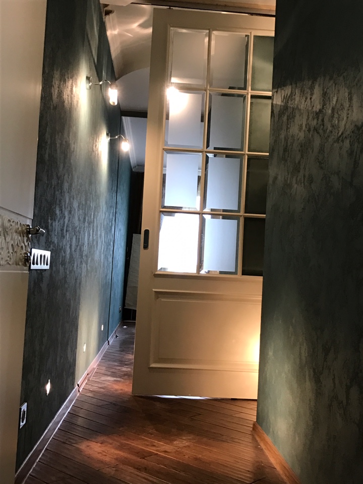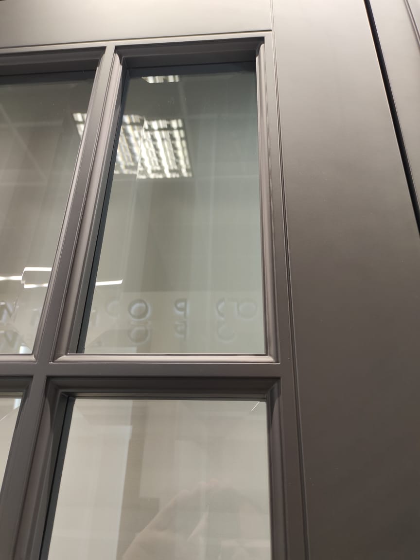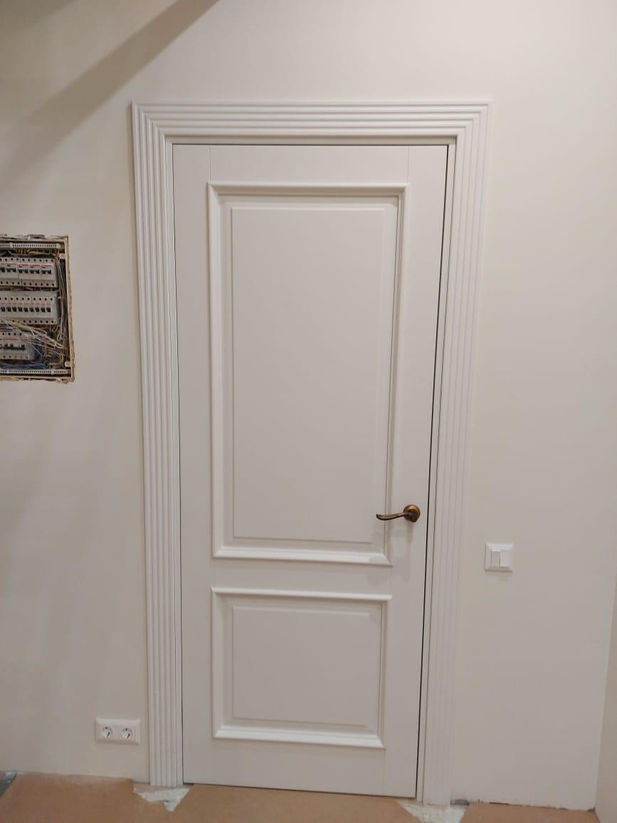 Полотно тамбуратное из инженерного массива (МДФ + ламельный/листельный массив лиственных пород) толщиной 50 мм. с повышенной шумоизоляцией,окра шенное матовыми красками итальянского производства SIRCA с эффектом «soft touch» по шкале RAL с возможностью двусторонней окраски. Объемные филенки, стекла крепятся к полотну с помощью фигурных штапиков (багетов).