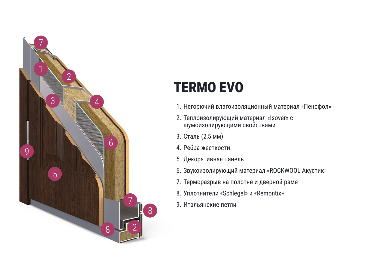 В основе конструкции — инновационная технология «терморазрыв», защищающая дверь от образования конденсата и наледи, обеспечивая эффективную теплоизоляцию даже при экстремально низких температурах. Это делает Termo EVO идеальным выбором для входных групп частных домов и коттеджей.